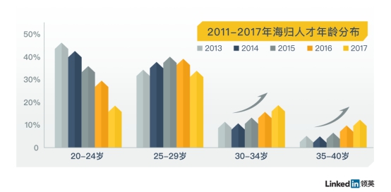 领英近期发布的《中国海归人才吸引力报告》显示,30-40岁的资深海外人才回流趋势明显。基于领英平台的海归人才大数据分析可以看出,从2013年到2017年,30-40岁的海归人才占当年海归总数的比率从16.5%上升至30.6%;而20-29岁的海归人才比率已经从79.7%下降到52.2%。