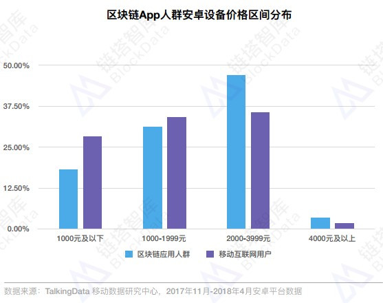 相比于移动互联网用户,区块链App人群所使用的安卓设备中2000元以上价位占比更高,2000-3999价位占比要高出11.3%。区块链App人群更加偏好中高档价位手机。