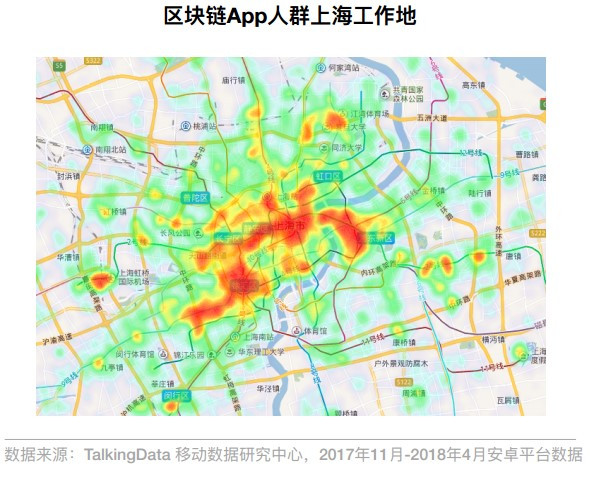 区块链App人群在北京的工作地更多的集中在中关村、上地、望京、国贸、金融街等互联网、金融公司密集区域。而在上海的工作地分布区域更为广泛,并没有明显的区域聚集中心。