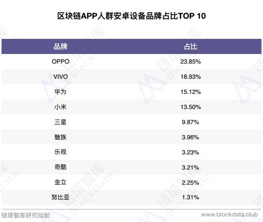 在区块链App人群安卓设备品牌占比中,OPPO、VIVO、华为包揽了前三位。三者相加占比已超总体50%,市场集中度相对较高。