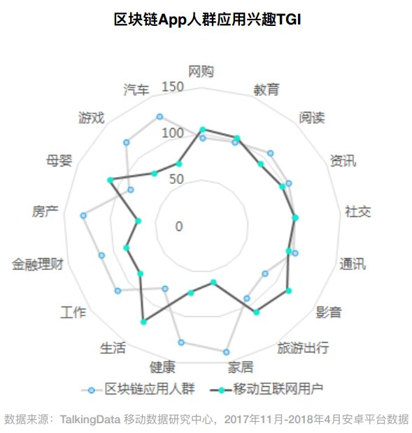 相比于移动互联网用户整体,区块链App人群的应用兴趣更多的集中在汽车、房产、金融理财、家居等领域,对于物质条件的追求更为直接。