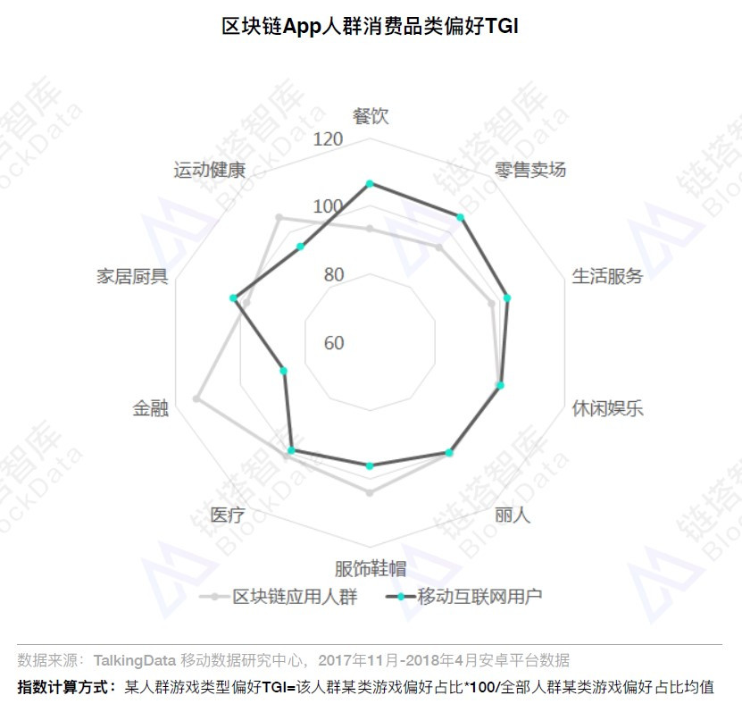 与移动互联网用户相比,区块链App人群更加偏好金融、运动健康类线下消费场所,对于资产管理、个人健康管理更为热心。