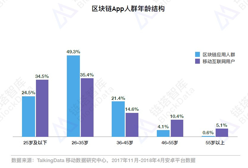 区块链App使用人群中,男性人群占比超过70%,男性占比要比移动互联网用户中男性比例高17.7%。