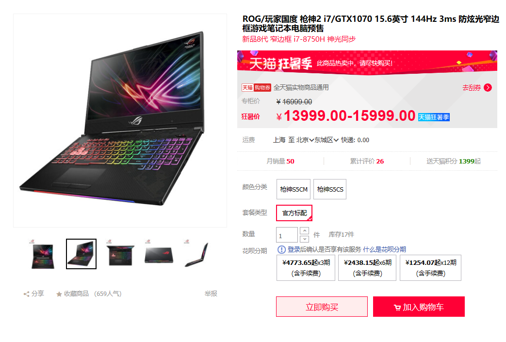 ROG枪神2天猫购买链接:https://detail.tmall.com/item.htm?spm=a1z10.4-b-s.w5003-18552679956.10.2569148bAtF2VY&id=571629030708&sku_properties=5919063:6536025&scene=taobao_shop