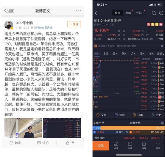 小米上市第二日股价开始强劲反弹,小鹏汽车董事长何小鹏也发表微博隔空“表白”小米和雷军,称自己“昨天和今天也通过二级市场,买了和拥有超过一亿美元的小米(感谢已经赚了点)”,并将小米股价涨至18.1港币的股价截图晒出,引得不少网友在评论中调侃“一夜小赚了1千万美金”。巧合的是,不少人发现何小鹏晒出的股价截图也正是雷军晒小米股价、吴晓波二十年来第一次开通股票账户所选择的富途证券的交易软件“富途牛牛”。