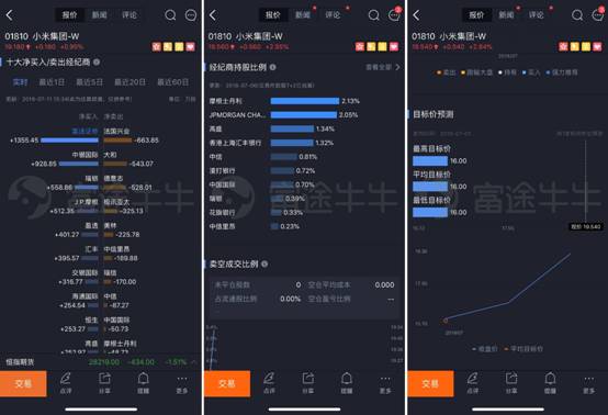 虽然上市首日破发,投资者对小米的信心并未减退——无论是散户还是业界大佬都在“买买买”,令小米股价在上市次日就涨了13.1%达到19港币,让雷军也有感而发“这两天像一场梦”,并晒出小米股价截图,而截图正是来自互联网券商“独角兽”富途证券的交易软件“富途牛牛”。