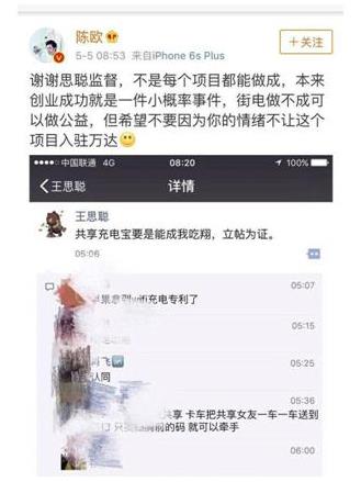 在2017年,万达的公子王思聪曾在社交平台上公开嘲讽共享充电宝,并定下“吃翔赌约”,陈欧则大方回应:不是每个项目都能做成,本来创业成功就是一件小概率的事件,街电做不成可以做公益。时隔一年,现在的社会形式下共享经济已成定局,广为熟知的有共享单车、共享充电宝、共享汽车等等,如今共享充电宝不仅有街电,还有云充吧,小电,怪兽等多个品牌存在于市场。在高档餐厅、咖啡厅、酒吧,乃至大型公共交通场所,机场、高铁站都有街电的身影,共享充电宝已经成为当下大众生活必不可缺的一样东西。