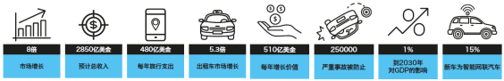 全球出行市场将呈爆炸式增长,预计到2030年全球出行市场将呈现8倍增长,预计收入高达2850亿美金,每年旅行支出在480亿美金左右,出租车市场将增长5.3倍,我们正在拥抱一个建立在APP上的新出行生态。我国政府也将智能网联汽车置于战略优先地位,到2030年,我们每年的增长价值为510亿美金,预防严重事故约25万起。智能汽车市场到2030年对GDP的影响约为1%,并且将会有15%的新车为智能联网汽车。