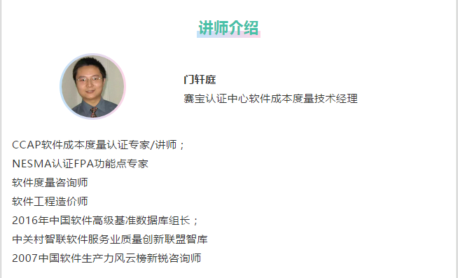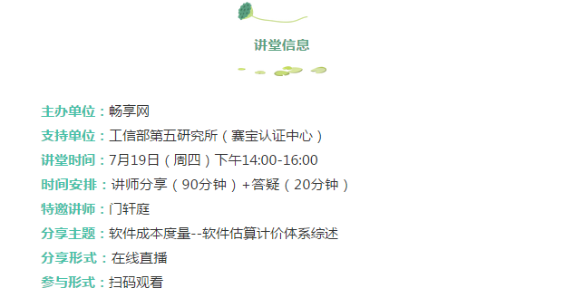 7月19日下午两点,畅享网特邀请:赛宝认证中心软件成本度量技术经理——门轩庭做客【畅享IT讲堂】,为大家在线分享:软件成本度量--软件估算计价体系综述。