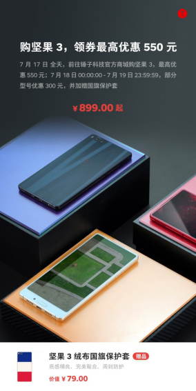 在锤子科技官网,坚果3享有领券减免活动,坚果3的4G+32G版本最高优惠400元,到手价为899元;领券后的坚果3 4G+64G版本同样直降400元,原价1599元,现价只需1199元;还有与之配套的坚果3绒布国旗保护套原价79元,现价仅需29元;坚果3前屏钢化玻璃保护膜原价49元,现价19.9元。