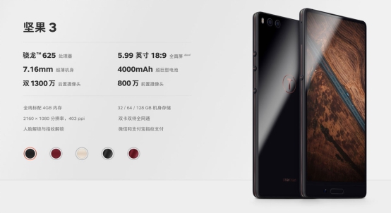 在配置方面,坚果3搭载了骁龙625处理器,运行内存为4GB,存储内存提供32GB、64GB以及128GB三种版本,可以满足人们的办公、娱乐等需求。同时,坚果3的电池容量为4000mAh,并配有QC3.0 18W快充技术,充满5分钟,可通话3.5小时。经网友测试,坚果3在满电的状态下,可连续播放视频9小时。