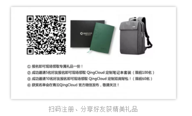 现在拿起你的手机,扫描上方二维码就可以免费注册参加本次大会。门票免费,成功邀请好友还可在现场领取 QingCloud 为你准备的礼品!数量有限,快来参加吧。