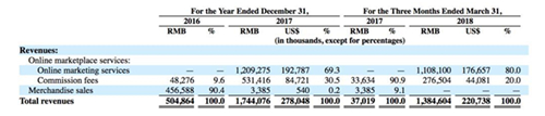从招股书看,拼多多的收入分为线上平台服务费和商品销售收入,线上平台服务费是包括线上推广服务费和交易佣金,模式跟淘宝天猫如出一辙。商品销售费主要是之前拼好货留下的自营商品收入。