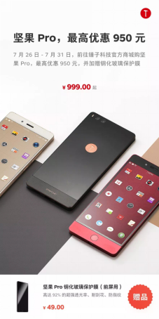 从7月26日至7月31日,拥有高通八核处理器、3500mAh大电池、1600万像素前置摄像头、5.5英寸全高清In-Cell显示屏的坚果Pro最高优惠950元,同时赠送价值49元的前屏钢化玻璃保护膜,售价999元起。