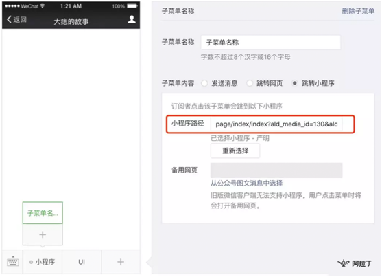 第二步:将生成的链接放置在【公众平台后台】-【自定义菜单】-【小程序路径】中并发布。以「公众号自定义菜单」广告为例,如下图: