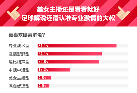 看世界杯不能少了球赛解说,当前专业战术型、激情澎湃型、逗逼相声型等解说风格各具特色。报告显示,钟爱专业战术型解说的球迷最多,占比三成,美女主播的解说受欢迎程度欠佳,仅占4.6%。