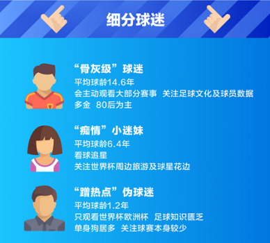 《优信数说世界杯之球迷众生相》报告将球迷细分为“骨灰级”球迷、“痴情”小迷妹、“蹭热点”伪球迷三大类,其购车偏好有所差异。