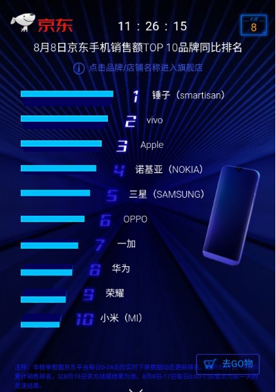 在京东手机销售额TOP10品牌同比排名榜上,锤子科技同样排名第一,在其身后的还有VIVO、苹果、诺基亚、三星、OPPO、一加、华为、荣耀、小米9个品牌。