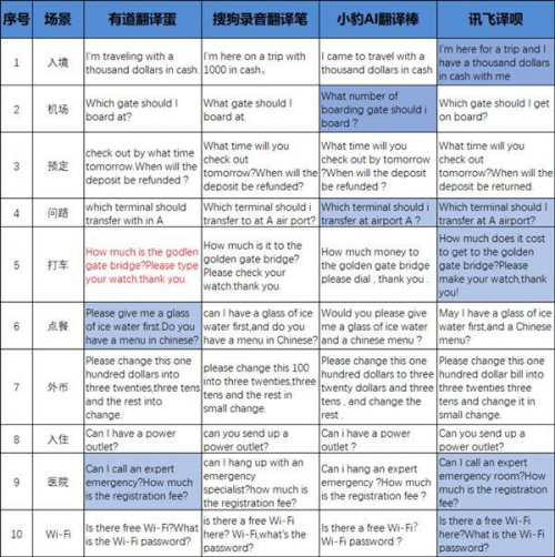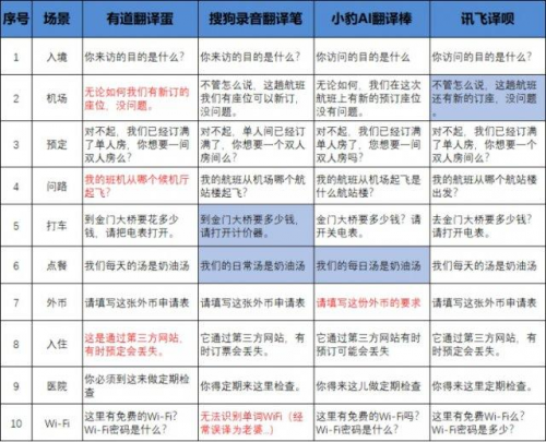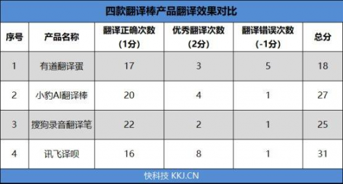 可以看到,讯飞译呗以8次优秀翻译领先其他设备,得分也是四者中最高的一个;小豹AI翻译棒得分次之,翻译效果也非常出色;搜狗录音翻译笔尽管优秀翻译次数较少,但表现非常稳定,只有1次翻译错误;而有道翻译蛋表现最差。