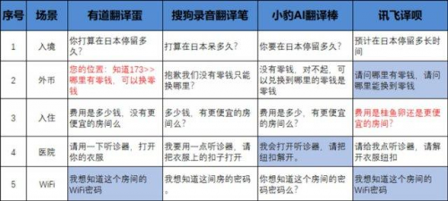 第1句送分题大家表现都还可以;第2句就出现了奇葩的情况,有道翻译蛋在正确识别到日文原文的情况下,出现了不知所谓的翻译结果,搜狗与小豹翻译部分正确,讯飞译呗尽管没有译出"すみません",但表述完整,可以辨识。