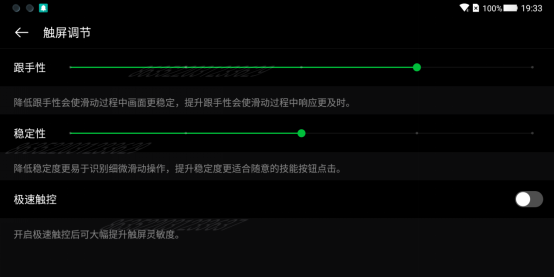 黑鲨游戏手机主打游戏性能,而触控操作直接关乎玩家的游戏体验,自然也受到研发团队的重视。从优化触摸屏超慢速滑动到优化多个热门游戏触控,可以说黑鲨游戏手机每次OTA更新后,玩家都能明显感受到触控体验的升级,而在此次最新推送的OTA版本上,黑鲨团队更是在原有的极速触控基础上,又添加了两个新的可调参数:跟手性和稳定性。