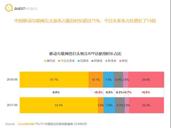 3)Questmobile 2018年6月APP使用时长数据统计显示,腾讯系APP总使用时长占比较2017年同期的54.3%下滑至47.7%,同比下滑-6.6%,主要因素还是头条系的强势增长,虽然抖音的崛起大家都有感受,但是看到数据掉了这么多还是难免恐慌,移动互联网战争之一就是抢夺用户时间,一旦用户时间被抢走,其用户价值就降低。