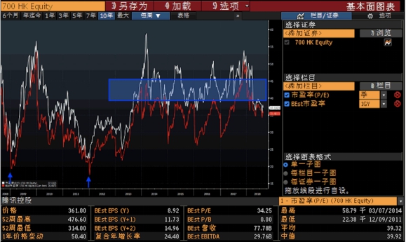 从腾讯过去十年的市盈率看,在2008年底和2011年底曾经出现过两个低点,一次是金融危机,一次是微博崛起而微信还未出来。在2013年微信打了一场翻身仗之后,腾讯估值水涨创高,一直维持在40倍PE左右。