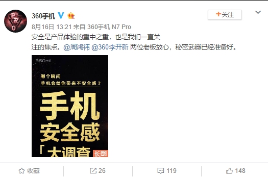 8月16日,周鸿祎在微博上@360李开新:“我记得新品是针对手机安全做了很多东西的,下周二发布会上,你们针对这个话题要给大家讲明白。”