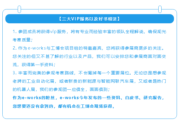 而作为本次e-works与工博会项目组合作的重中之重,便是联合组织e-works工博会观光团!报名参加e-works工博会观光团,您将免费获得以下服务:
