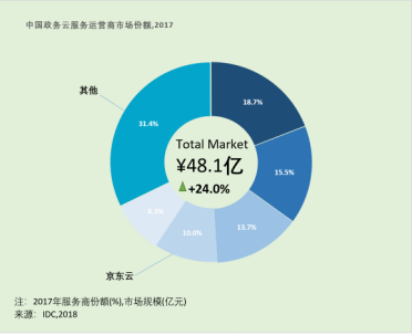 报告显示,2017年政务云服务运营市场整体规模达52.8亿元,其中IaaS层整体规模达48.1亿元,同比增长24%。截止到 2018年6月,已有超过 260个省市完成政务云从 0到1的建设,其中超过 150 个省市政府通过采购服务方式(以租代建+按需购买)进行政务云建设。京东云政务云以创新的模式、互联网公司的技术优势和生态系统优势受到各地方政府尤其是有产业发展转型需求的政府欢迎。