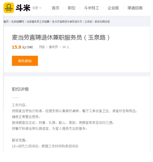 以往在餐厅吃饭,为我们服务的基本上都是清一色的年轻人,而现在渐渐出现了许多妈妈辈阿姨们的身影。与此同时,很多餐饮企业在招聘的时候也放宽了对服务员的年龄限制,更有餐企还专门设置了大龄服务员的岗位。笔者登陆国内最大的灵活用工服务平台斗米发现,在连锁西式快餐巨头麦当劳发布的招聘信息上,还特别标注了招聘“退休员工”的字样。不仅是麦当劳,汉堡王、肯德基等品牌连锁餐饮企业也向大龄人员抛出了“橄榄枝”。