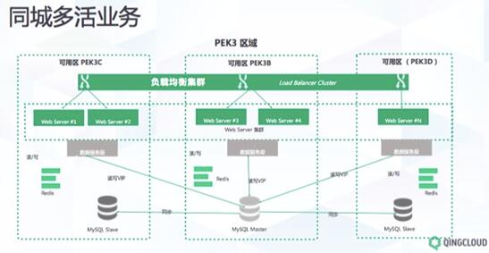 接下来我们来分析具体的实现同城多活的应用场景,以青云北京3区为例,在三个可用区(B、C、D)之间共享一套负载均衡器集群,由于SDN 3.0中增加了任播公网IP功能,通过BGP AnyCast的方式,把一个IP部署在多个可用区之间,即便有一个可用区光纤中断时,也可以自动把业务切换到其他的可用区,这样就可以在更大程度上保证用户业务的可靠性,以此达到多活的效果。