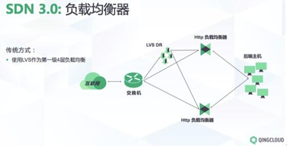 原来在SDN 2.0时,业界普遍采用的是LVS集群,所有的公网交换机的流量都要经过LVS,并转发给负载均衡器,一般来说,通过增加负载均衡器集群,就可以满足大部分扩展需求。但也可以看出其弊端,那就是LVS作为单点,承担着所有的入口流量,这也使得用户上传流量增多时,LVS无法水平扩展。因此,青云SDN 3.0在SDN 2.0的基础上做出了全新的改变,在网络部署上干脆抛弃了原有的LVS,直接使用SDN交换机来代替LVS承担第一级负载均衡器的角色。
