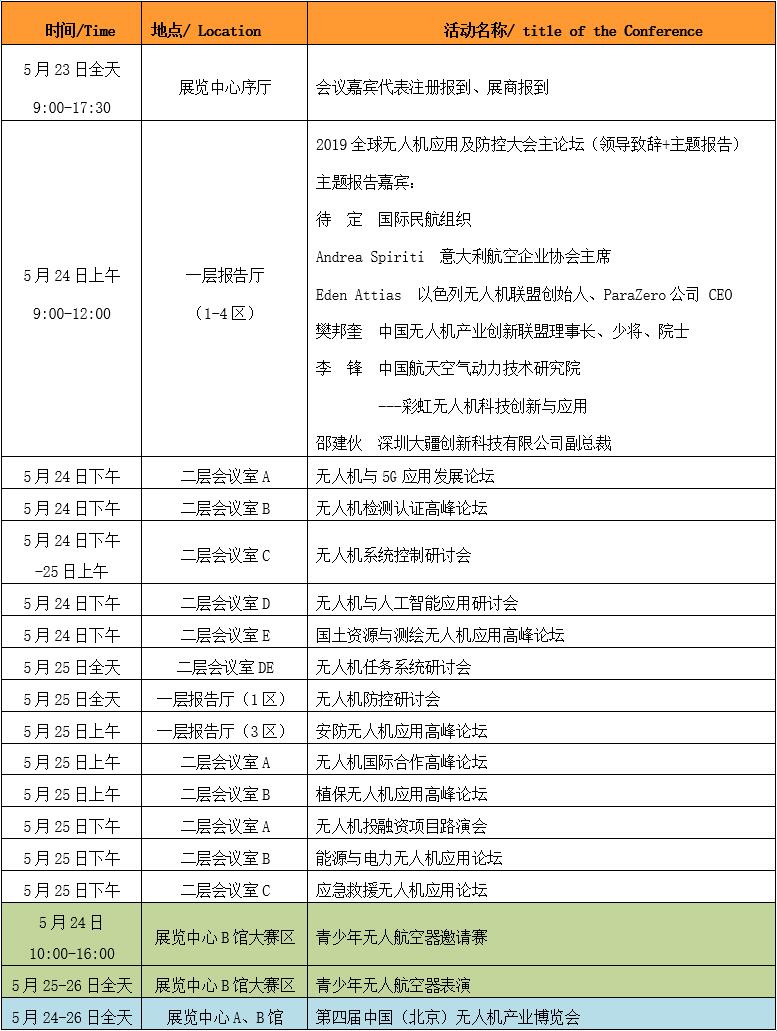一、会议主题 领航全域、展翼未来 二、会议简介 我国无人机系统经过近50余年的发展取得了诸多重大成果,工业无人机研发与产业化不断取得突破,将迎来爆发式发展。全球范围内,工业级无人机需求持续增长,在众多行业中得到了广泛应用,未来,无人机拥有广阔的应用前景,显示出巨大的市场潜力,同时也面临着风险和挑战。无人机系统是高度科学化、高度社会化、高度战略化的高端制造装备,必将引起新一轮工业社会变革。近期习主席多次视察无人机企业,对无人机系统发展高度重视、寄予厚望,国家工程院、科技部、工信部等有关部门将无人机系统发展列为“中国制造2025”的重点,开展战略研究和重点部署,提出发展规划和指导意见,着力整合社会资源,推动我国无人机系统及相关产业健康有序发展。无人机系统的研制与应用已成为我国经济创新发展的新亮点和增长点,我国无人机系统正逐渐走上国际舞台,将成为“中国制造”又一张名片。 在此背景下,中国无人机产业创新联盟将于2019年5月24-26日在北京举办“2019全球无人机应用及防控大会”。组委会致力于将会、展、赛相结合,打造一场高规格、高水平的无人机产业应用国际盛会,助推国内无人机产业健康、有效发展,加强无人机区域国际交流合作,探索国际无人机产业创新发展之路。 三、大会亮点 (一)“会、展、赛”相结合,打造最大规模、最高规格行业盛会 大会设有10余场会议,2万平展览、1个比赛同期举办,预计有500多位国内外嘉宾、2000多位代表参会、200多家展商参展、2万余名专业观众,将成为行业规模最大、规格最高的行业盛会。 (二)汇聚全球无人机行业顶级专家,探讨无人机产业创新发展之路 汇聚来自全球20多个国家和地区高校、科研院所、领先企业的百余位无人机领域专家、企业家代表,分享国际最新研究成果与创新应用案例,展开巅峰对话,共同探讨全球无人机的发展趋势。 (三)聚焦行业应用,链接无人机全产业链,搭建产学研用交流对接平台 云集植保、安保、消防、测绘、能源电力、运输物流等各领域行业用户,聚焦应用市场热点话题,探索行业解决方案与未来发展之路。 (四)优质科技服务,助推行业精准对接 大会提供技术合作、投融资合作、国际合作、产品推广、项目落地、“一对一”精准对接等科技及相关专业服务。 四、组织机构 (一)主办单位 中国光学工程学会 中国无人机产业创新联盟 IAN意大利航空企业协会 (二)承办单位 中国无人机产业创新联盟 中国质量认证中心 中国红外与微光产业创新联盟 国家工业控制产业创新联盟 IUA以色列无人机联盟 ENAC法国国立民航大学 (三)联办单位 工业和信息化部装备工业发展中心 国家电网有限公司 中国航天空气动力技术研究院 中国航空工业发展研究中心 中国测绘科学研究院 农业部南京农业机械化研究所 国家无线电监测中心 中国软件评测中心 中国联通网络技术研究院 深圳大疆创新科技有限公司 ICAO国际民航组织 IATA国际航空运输组织 JARUS国际无人机标准制定组织 EASA欧洲航空安全局 ASTM美国材料与试验协会 (四)大会主席 吕跃广中央军委科技委常任委员、少将、院士 樊邦奎中国无人机产业创新联盟理事长、少将、院士 刘先林中国测绘科学研究院名誉院长、院士 姜景山中国科学院空间科学与应用研究中心总工程师、院士 陈志杰国家空管委专家组组长、少将、院士 孙聪 中国工程院院士、中国航空工业沈阳飞机设计研究所总师 王沙飞军事科学院系统工程研究所少将、院士 刘永坚空军研究院少将、院士 翁志黔 西北工业大学原副校长 Catalin·Radu国际民航组织空中航行局副局长 Andrea Spiriti意大利航空企业协会主席 Eden Attias以色列无人机联盟创始人 (五)大会共主席 王守杰中国无人机产业创新联盟秘书长、北京信息技术研究所少将 王英勋北京航空航天大学无人系统研究院院长 都基焱陆军航空兵学院研究员、少将 兰玉彬华南农业大学教授 贾平中国科学院长春光机所所长 赵民中航工业成都飞机设计研究所所长 宋科璞中航工业西安飞行自动控制研究所所长 李锋中国航天空气动力技术研究院 邵建伙深圳大疆创新科技有限公司副总裁 陆梅中国质量认证中心主任 孙永生中国低空安全研究中心主任 文运丰中国电子科技集团第五十四研究所副所长 田刚印北京中航智科技有限公司总裁 姜梁中国航天电子技术研究院无人机所所长 苏文博沈阳无距科技有限公司总经理 孙逊一飞智控(天津)科技有限公司联合创始人 严余松 成都工业学院校长、党委副书记 刘长利 北京远望智库科技咨询有限公司总裁 五、国际嘉宾名单(部分) Catalin·Radu国际民航组织空中航行局副局长 Andrea Spiriti意大利航空企业协会主席 Eden Attias以色列无人机联盟创始人,ParaZero公司 CEO Grégoire Thomas法国Azur Drones公司副主管 Stephane Morelli法国Azur Drones公司联合创始人 Thibault Bonnevie法国SGB Systems公司CEO ENAC法国国立民航大学 Sergio Barlocchetti意大利DronItaly/Futuroaere公司 Roberto Caminiti意大利Brancaro Industries公司CCO Rosario Cannavo意大利Cogtech公司 CEO Fulvia Quagliotti意大利MAVTech/PoliTO公司CEO Kelly Attias美国AmpedRF公司 CTO Dana Keren以色列ParaZero公司总裁助理 六、大会整体日程
