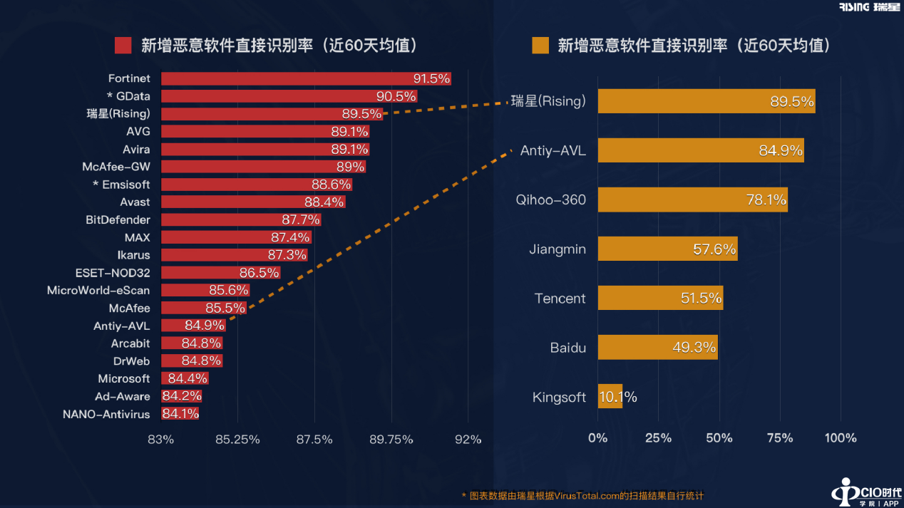 衡量一款引擎的好坏主要看它对新出现的恶意代码的识别能力,也就是零日恶意软件的识别能力,在这一点上,通过统计全球安全厂商最近60天的识别率均值发现,瑞星检出率为89.5%,位列前三,如果只看国内安全厂商对于新增恶意软件识别率的话,瑞星排名第一,这就意味着瑞星威胁检测引擎是国内最强的反病毒解决方案。