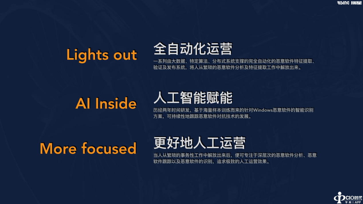 1、全自动化运营。把恶意软件特征提取,或者说本地引擎的运营工作,从原来的“完全依赖人工”,转变成了“几乎不依赖人工”,这个过程在制造业那就是“熄灯工厂”,关灯后依然自主地进行着工作。