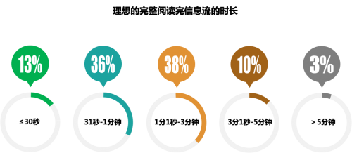 网友在浏览信息流时常常希望在3分钟以内看完(1分钟内占比49%,1-3分钟占比38%),只有3%的网友原因花5分钟以上的时间去浏览一篇信息流文章。