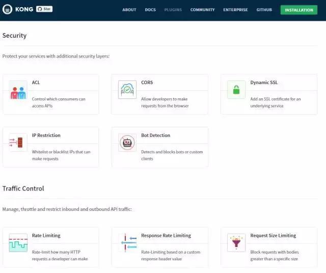 Kong一个非常吸引人的特色是它的丰富插件,有认证,安全,限流,监控,转换,日志等多种类型插件,能轻松配置完成访问控制,黑白名单设置,限流,跨域等等功能。