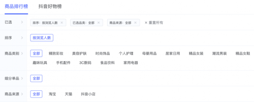 在商品类别中,可根据选择商品所在的行业分类、细分单品进行榜单筛选,当前支持查看淘宝、天猫、抖音小店三个渠道的商品来源。