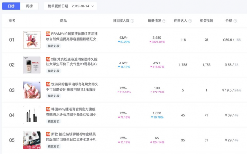 通过榜单,可以直观地查看商品浏览人数、销量情况、在售达人、商品售价等信息。