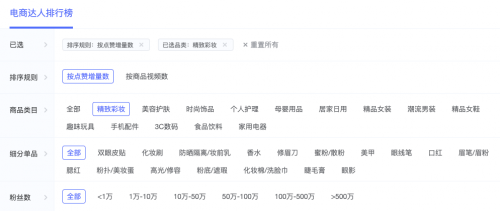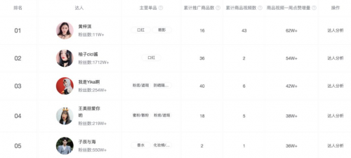 通过达人排行榜,可直观地查看达人的主营单品、累计推广商品数、商品视频数、推广商品视频一周点赞数等。