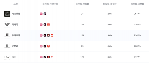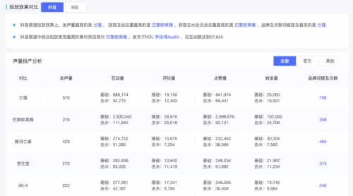 在投放效果对比上,通过声量投产分析,可查看不同品牌的发声量、互动量、评论量等互动数据对比。通过查看效果最好的创意Top 5,借鉴学习竞品优质的创意案例。