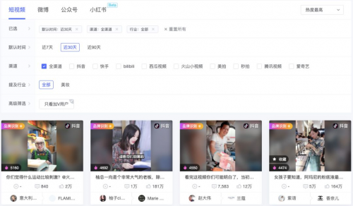 搜索功能支持对短视频/微博/微信热文进行自主搜索,按渠道、日期分类筛选出相应的短视频和图片创意。