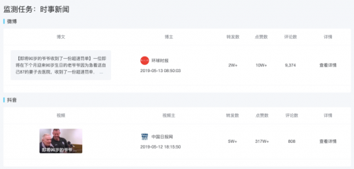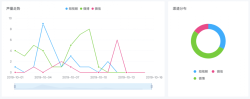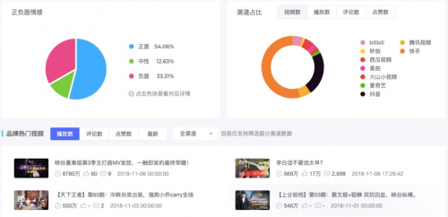 舆情监控涵盖短视频、微博、微信等渠道,用户输入关键字,即可监测竞争对手或自身产品/品牌的营销动态,例如产品在各平台的营销声量/效果、相关评论的正负面情感、热门视频/文章、主要KOL等信息。