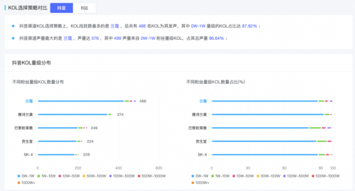 在KOL选择策略上,可查看各品牌在不同粉丝量级KOL的数量分布、重点投放的Top 5 KOL等数据。