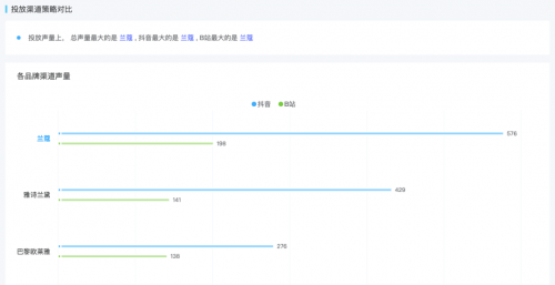 在投放渠道策略上,可直观地查看各品牌在各渠道的声量对比。此外,还可查看不同品牌的发声时段和声量效果。