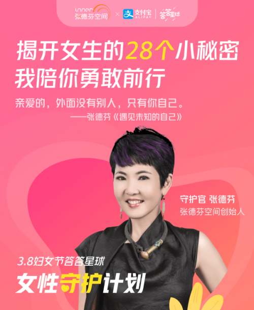 支付宝答答星球同时也邀请到了张德芬空间创始人、著名个人成长作家张德芬老师担任支付宝答答星球活动的“女性成长守护官”,与大家共享女性成长的28个瞬间,为女性前行的力量添一份温柔的助力。