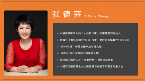 张德芬老师是中国深具影响力的个人成长作家、张德芬空间创始人、北京朝阳海外人才“凤凰计划”顶级津贴专家、中国志愿服务基金会心理健康与发展专项基金形象大使。个人也曾被评为“ 2019年度中国心理产业年度人物 ”、“2019心理产业突出贡献年度人物”“2014年十大品牌女性”、“影响中国女性生活精英人物”、“年度优雅女性人物”等。