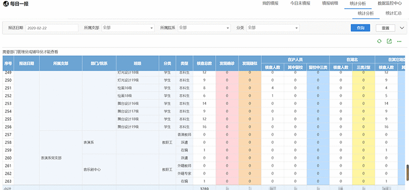 为贯彻落实教育部提出的“人盯人”措施,全面摸清、准确掌握学生所在地区、健康状况等信息,坚决防止疫情向校园蔓延,上海戏剧学院连夜组织技术骨干克服各种困难,仅用了三个工作日,便在上海各高校中率先推出“每日一报”信息报送系统。该系统通过全体师生在每天23点前自主如实上报健康情况,不仅帮助各支部书记、班主任及辅导员提高了疫情防控收集、统计和上报的工作效率,更是大幅度提升了上报的及时、准确性上得到。