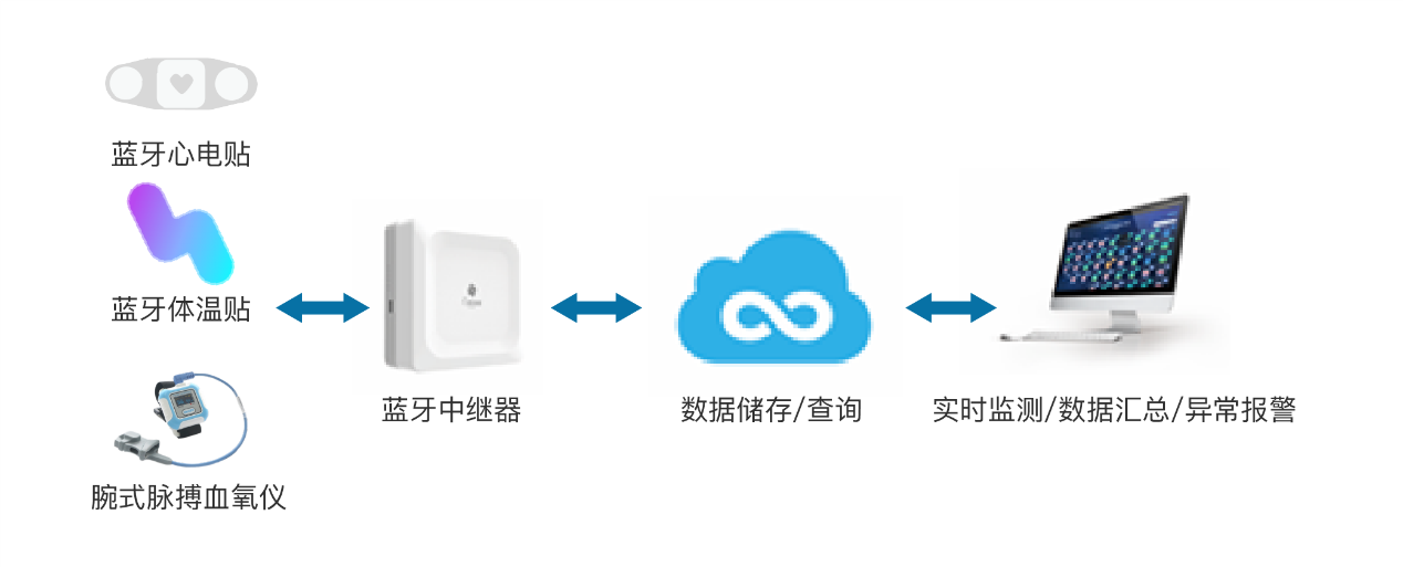 远程“体温+血氧”的同步体征监测已经在武汉某疫情定点医院投入使用。病房内,患者佩戴体温贴和动态血氧检测仪,采集体温及血氧数据,通过蓝牙路由器发送至护士站信息系统。针对定点医院人员密度大、环境复杂的特点,该系统经受住了覆盖范围、抗干扰能力、稳定性能、安全性能的多重考验,在实际使用中交出了一份完美的答卷,获得了医护和患者的高度认可。